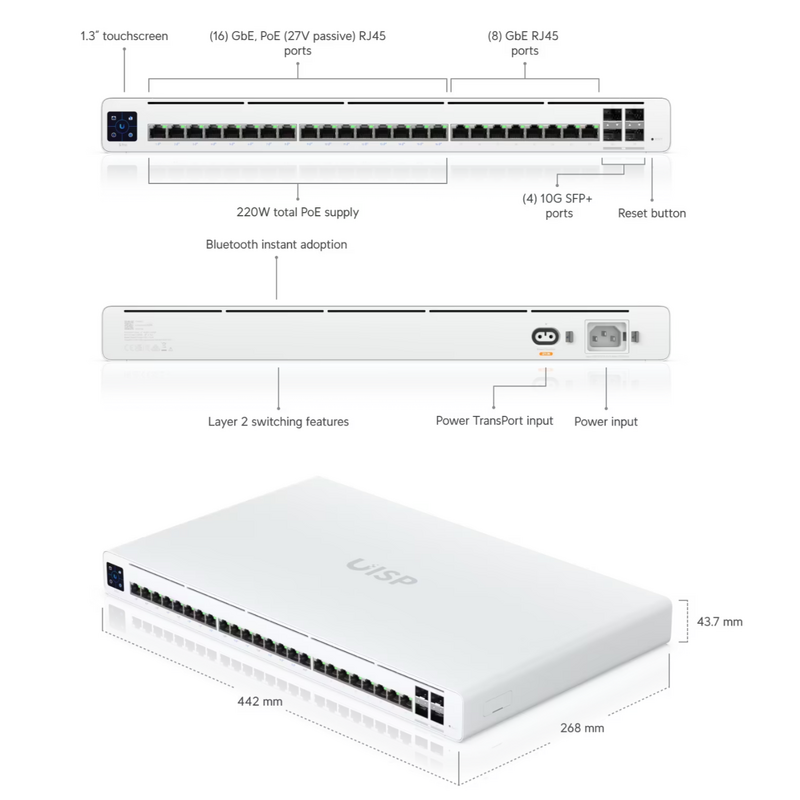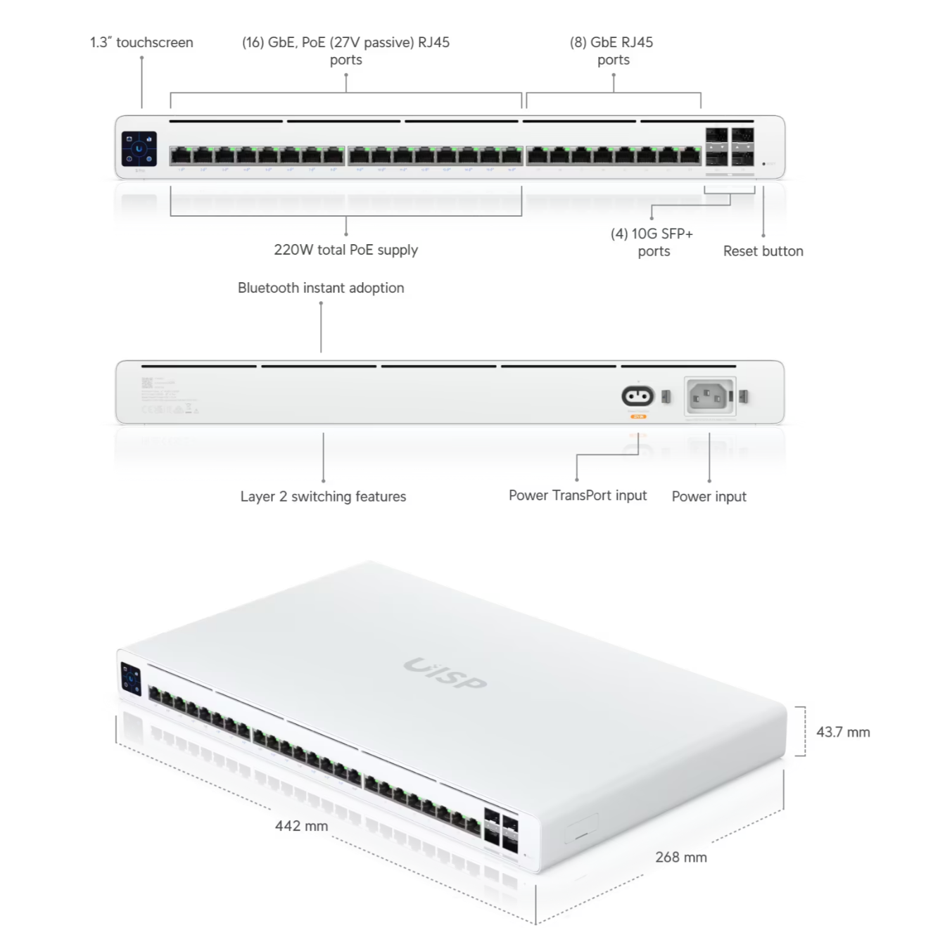 • (24) GbE RJ45 ports, including (16) with 27V passive PoE output